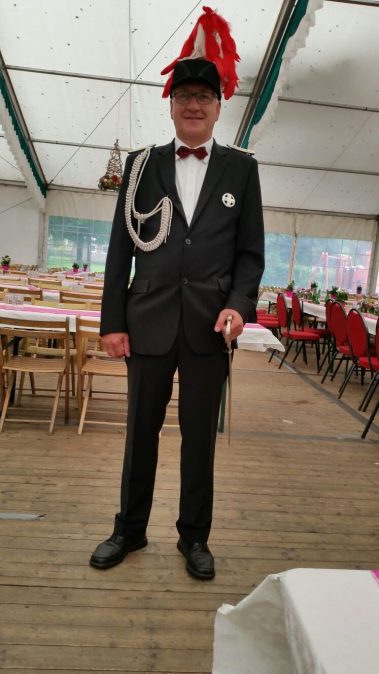 Aus gelben Krepp-Papier hatten sie, natürlich von Roßhack, Schärpen gebastelt. Beim Abkränzen wurden gelben Schärpen verteilt und alle marschierten zum letzten Mal mit viel Spaß in der Halle vom Schützenkönig Josef Engels. Unter Anleitung von Erwin Lehnen, Peter Holtappels und Willi Trienes wurden sogar besondere Variationen ausprobiert, die man im Zelt nur beim Aufmarschieren zum Königstanz beobachten kann. Seit der Zeit geisterte die Idee vom „Gelben Zug“ durch die Köpfe und Erwin Lehnen tat alles, um die „Nicht-Schützen“ zu überreden einen neuen Zug zu bilden. Im Scherz wurde immer wieder darüber nachgedacht, einen neuen Zug zu gründen, aber es fand sich kein richtig geeigneter Name für den Zug. In der Zeit vom ersten Marschieren des „Gelben Zuges“ bis zum „Neuen Zug“ trafen sich in jedem Jahr, ob Vogelschuss oder Schützenfest, die gleichen Männer und Frauen am Pavillon vor dem Festzelt auf dem Schulhof, die vom gelben Zug sprachen, aber sich nicht entschließen konnten in die Bruderschaft einzutreten. Ab Herbst 2002 gab es dann endlich mehrere Treffen, zu dem die Pavillon-Truppe andere interessierte Männer einlud, um einen Schützenzug zu gründen. Am Ende startete man tatsächlich mit dem Namen „Neuer Zug“, weil kein besserer Name gefunden wurde. Vor dem Vogelschuss 2003 war es soweit, Theo Vieten wurde zum Offizier gewählt und es fanden sich genügend Männer, die den „Neuen Zug“ bildeten.